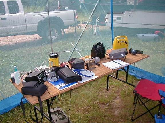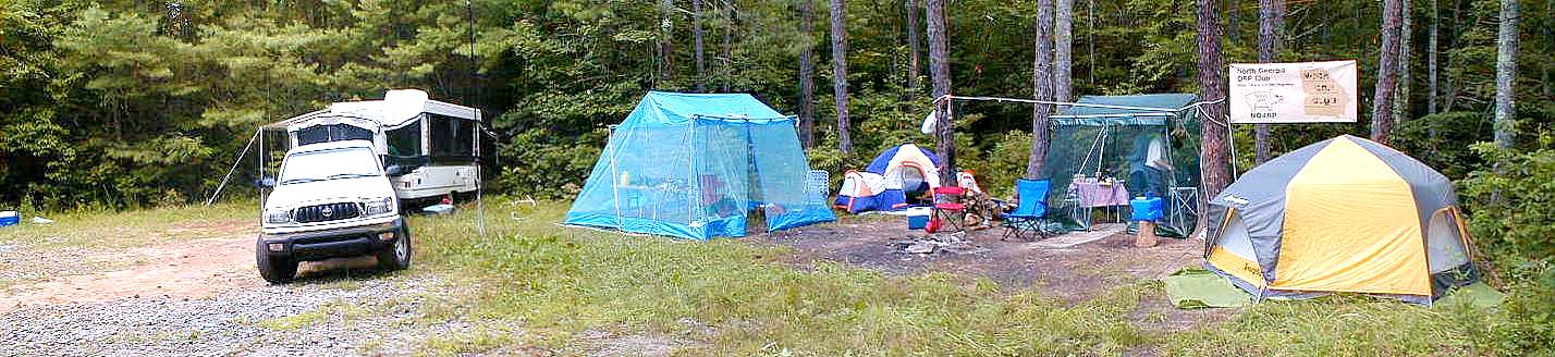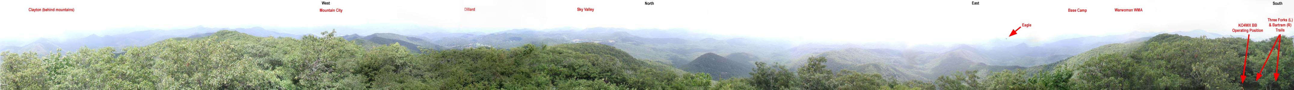 Click here to read Scott's review of this event. Click here to see a panoramic view from the top of Rabun Bald that was taken by Mike, KO4WX. The arrow points to Mike's BB operating position, on the Bartram Trail as it comes over the top of the mountain. Click here to see a panoramic view of the campsite taken by Sam, AE4GX.