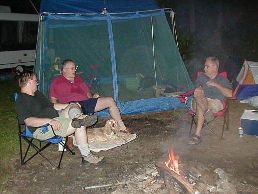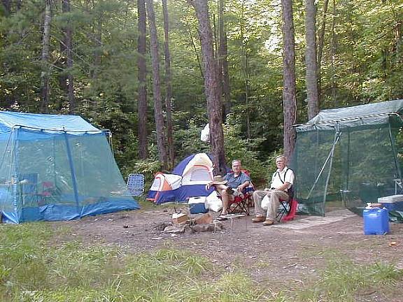 ![]() Left to right early Friday Afternoon. Sam's screen tent which was the operating tent. Sam and Pickett's sleeping tent. Picketts food services screen tent and the NoGa Banner which we hoped would scare away the bears. |