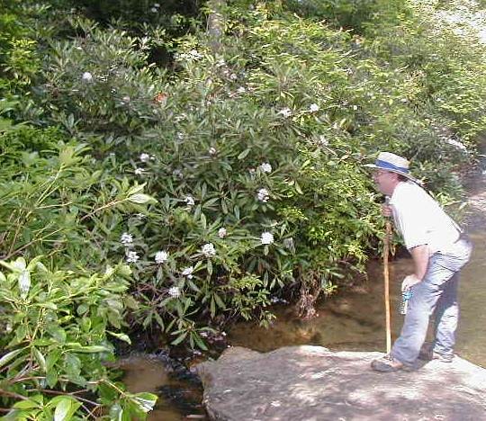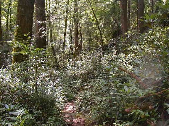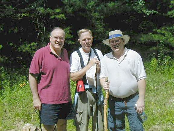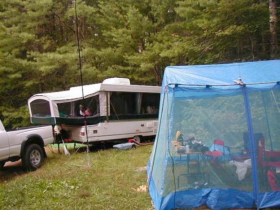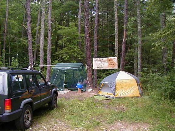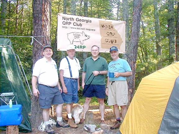 Four intrepid NoGaNaughts made their way up the north east slopes of Rabun Bald to prepare for the ARS Flight of the Bumble Bees - 2003. A nice wide camp site surrounded by tall trees was selected deep in the Chattahoochee National Forest. This provided more than enough space for the 2 tents and the opulent rolling palace of Scott, KD4MSR. This event was sponsored by Scott and he really did a great job of researching an esoteric site but also the history of the Bartram Trail that runs over Rabun Bald and through this part of Georgia.
