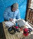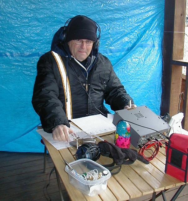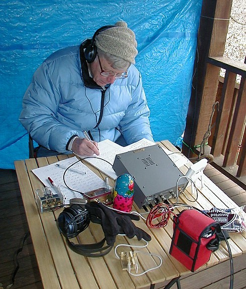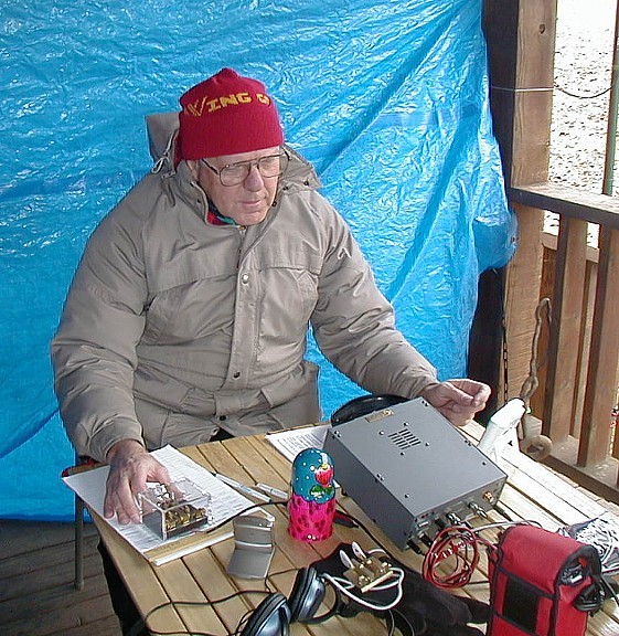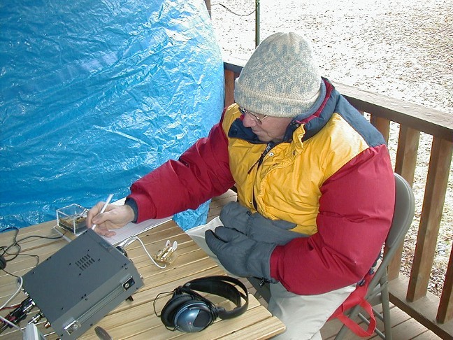 ![]() Bob, AA4CX, putting one in the log. The wind was blowing about 15 mph and gusting higher so we put up a tarp to block the wind. I can't imagine what the wind chill factor was. |