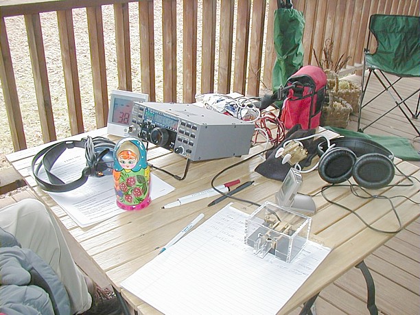 ![]() Operating position. K4TJD's K2 and battery power. The antenna was a doublet at 25 ft on Joe's DK9SQ mast. You can see the ScQRPion paddle near the headphones. AND "Matryoshka" who will be with us wherever we go. |