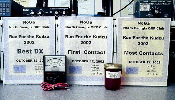 The primary object of this event is to have a fun, qrp radio day. The format is to demonstrate that you can carry all of the equipment that you are going to use in the event. This includes rigs, power, antennas, tables, chairs, etc. Following this demonstration setup begins. The bell at the pavilion rings at 11:00 am and operating continues until 1:00 p.m. when the bill rings again. Then it is BYOL time. "Bring Your Own Lunch".. NoGaNaughts are well known experts at this activity. And finally, awards and door prizes concluded the day's activities. There were some great door prizes including an MFJ Clock, a RS VOM, MFJ DC distribution strip, brief case, Horton dipole, SOP RX kit, FireBall 40 kit and more. Thanks to all the fine prize donors.