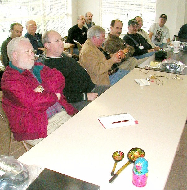 ![]() L/R Ken, W4DU, Dave, N4DJS, Mike, KO4WX, Steve, AA4BW, Russ, AE4NY, Jim, K9GKB, Marvin, W4UXJ (no one else has ever held that call) and Ed, N4XY. Check out Ken, Dave, Mike and Marvin. Maybe Ed needs to spice up his presentations a little. |