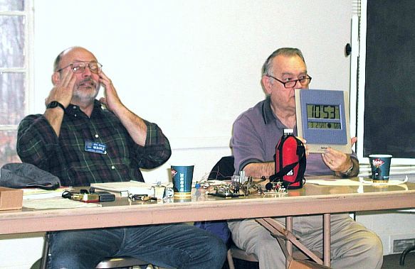 ![]() George, WA4TNU, shows his great atomic clock buy. Mike, W3IRZ, can't believe his eyes. |