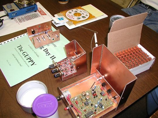 ![]() Tom, K4TJD's stash. Top to bottom.. Solder pot for the toroidialy challenged, Guppy, CQ Serenade audio CD, SMK-1 with enclosure, Vect. RX with enclosure and Norcal Cap kit. |