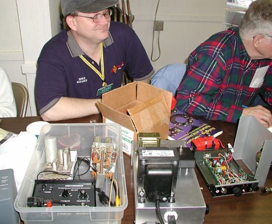 ![]() Mike, W3IRZ, and his DDS project. Now is that neat wiring or what..? George is hanging on every word. |