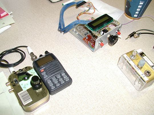 ![]() Mike, W3IRZ's, stuff. L/R.. Antenna tuner, DDS VFO project and unique Warbler tester. Provides keying and audio to tune up with. |