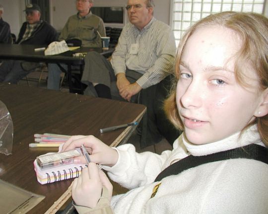 ![]() Travis Boatright and her CW keyer. She had laryngitis and her dad, Mike, KO4WX, was helping her communicate. |