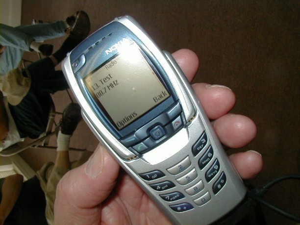 ![]() Phil, K4PQC, shows off his cell phone with an FM receiver. He uses it as he moves around his shack to listen to the receiver using an FM rebroadcaster. |