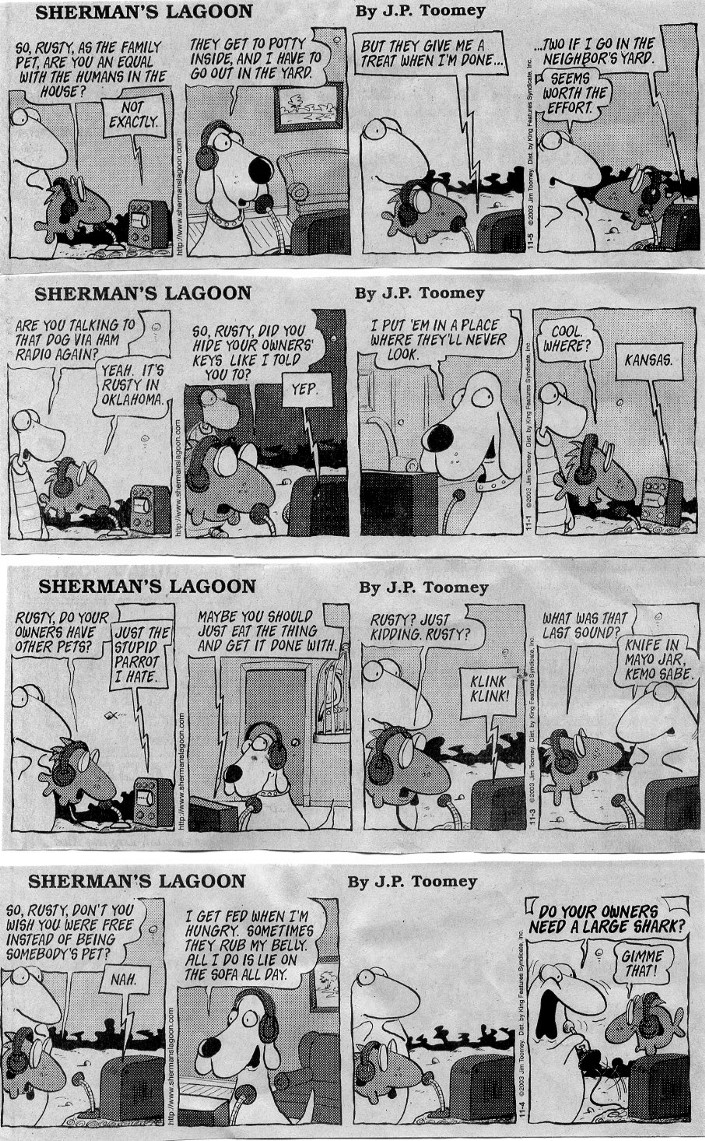 One of the most popular newspaper comic strips over the last few decades has been a strip about a big shark and his buddies "Sherman's Lagoon". A number of years ago the strip featured an ongoing series about Ham Radio and we have been given permission to display these panels on our web site. The cartoonist is Jim Toomey and these strips are distributed by King Features Syndicate. The panels are used by permission of the author.